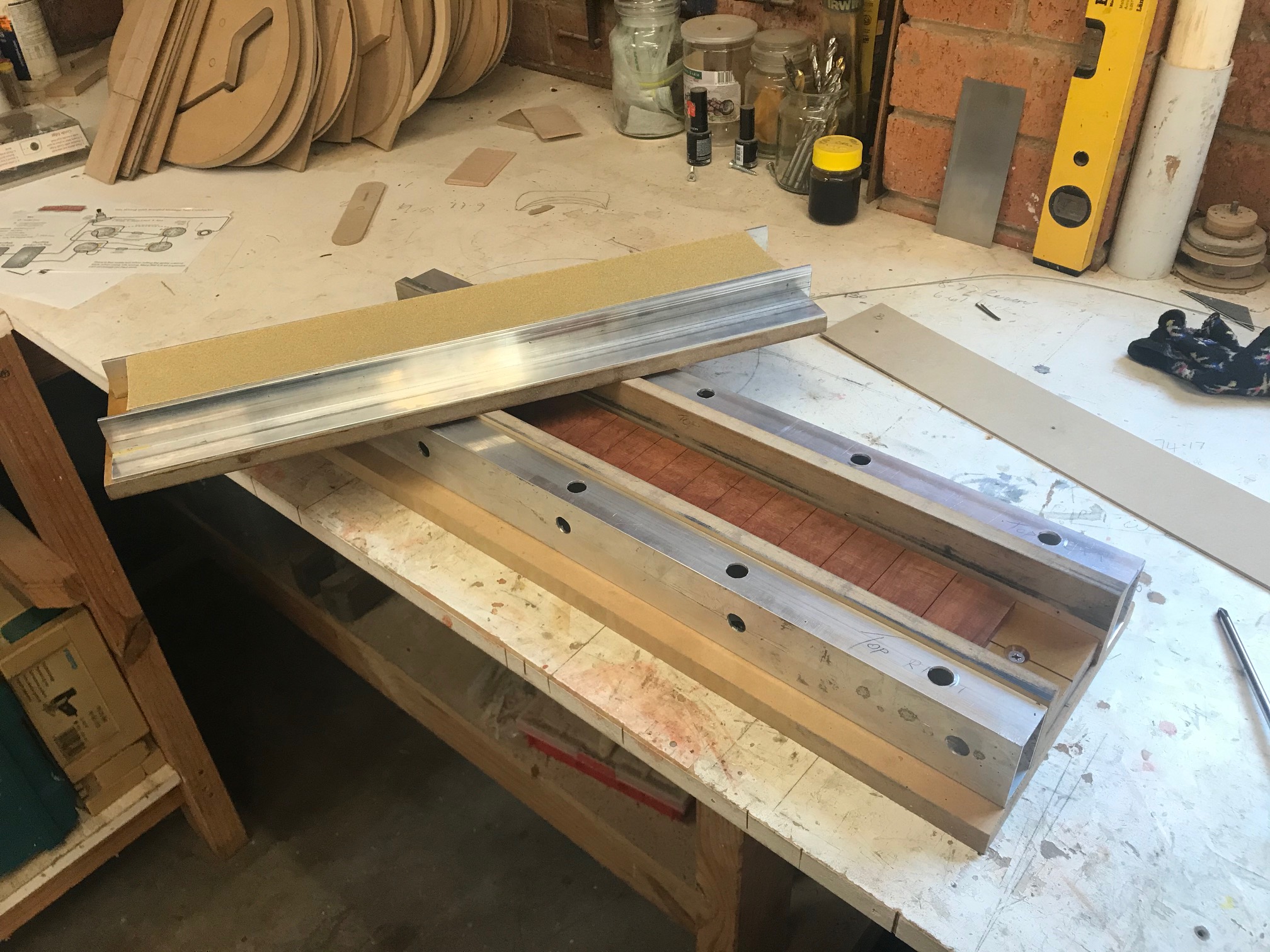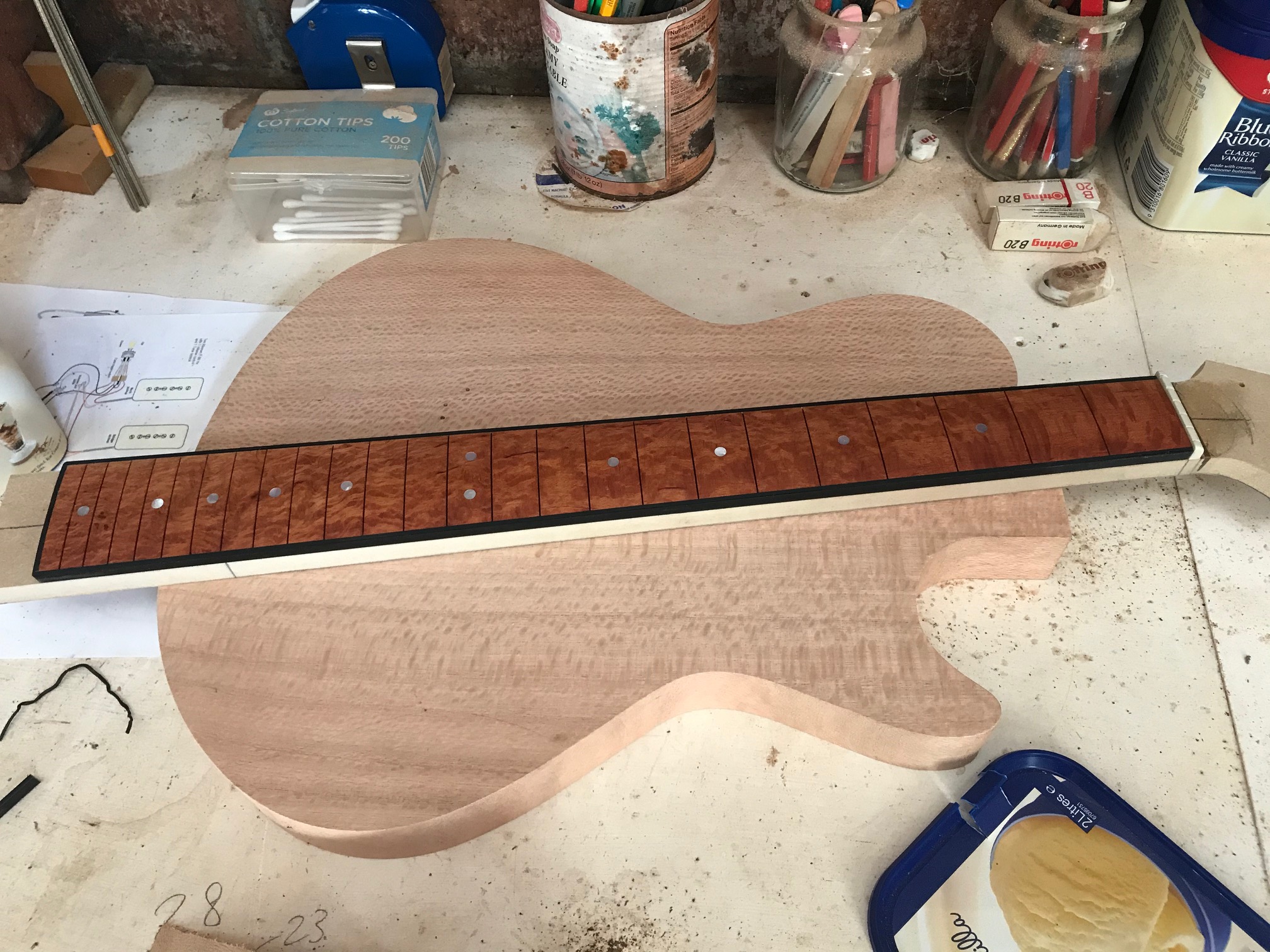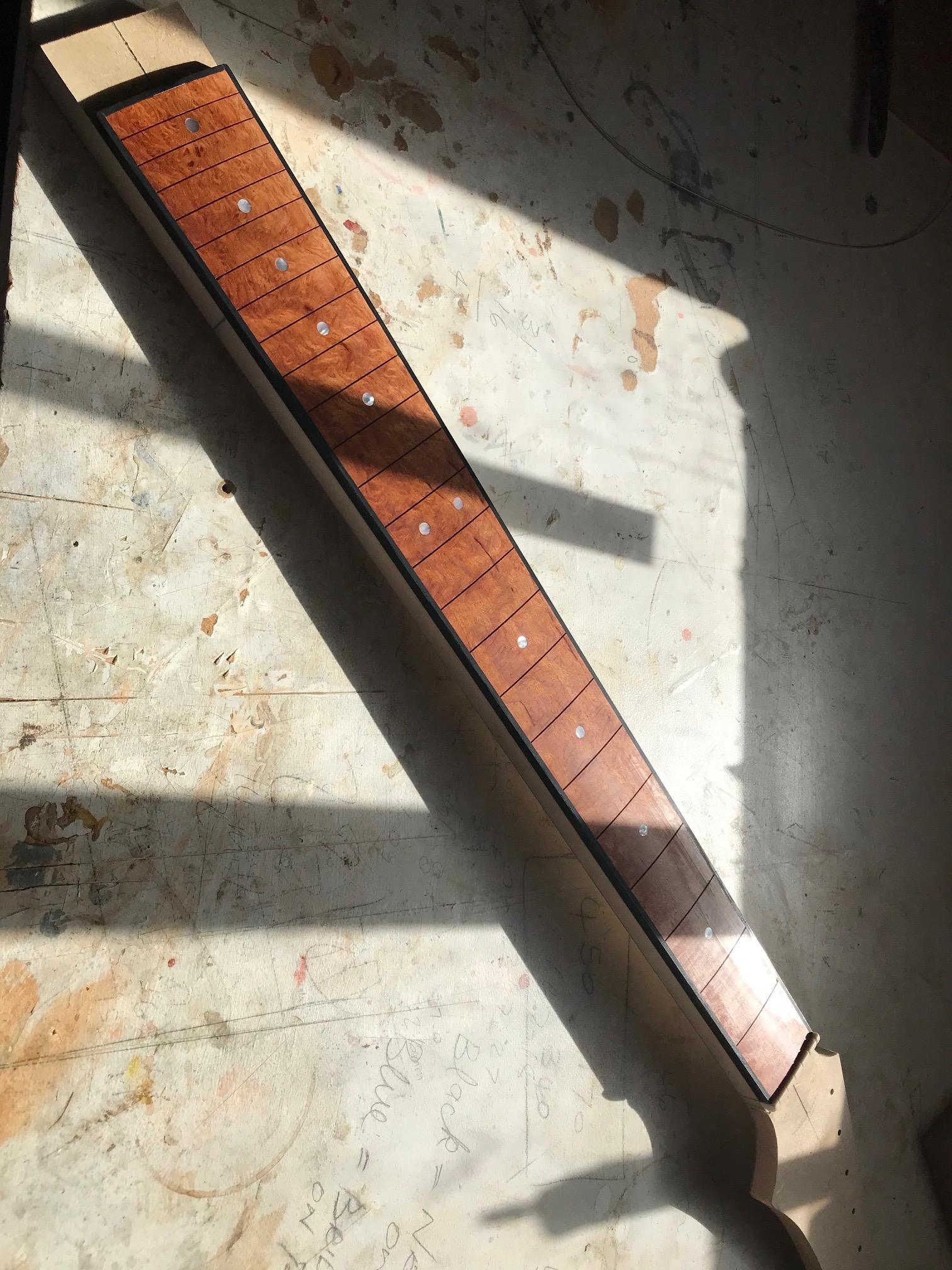This one’s going to have 24 frets. And it’s slightly on the wider side to match with the bridge. First setting out the frets, and then radiusing it to get the right shape. It comes up really nicely, the casuarina. It’s a nice rich red colour.