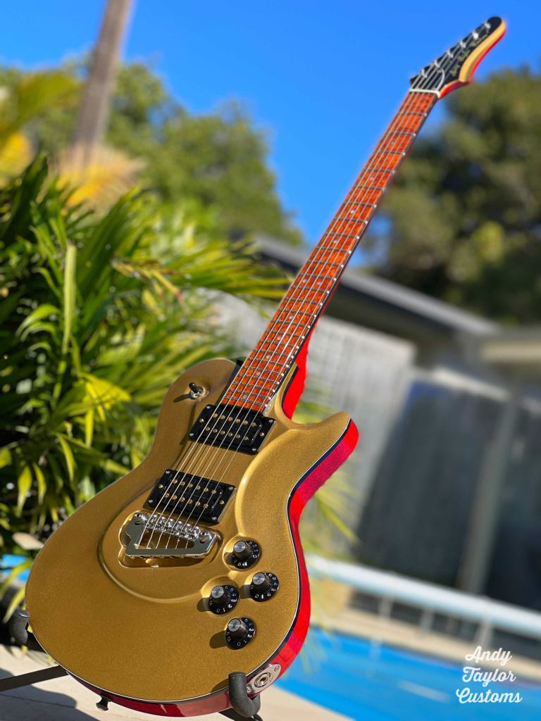 C-3PO is made from all Aussie timbers. The piece of wood for the body was found to have a nasty hidden knot which only became apparent on cutting. This led to a revised body shape similar to a Les Paul, but due to its shorter body length it was originally dubbed ‘Les Small’. As the build progressed and the carved cap took on a more sculptured look (and it turned gold) it has been renamed ‘C-3PO’.