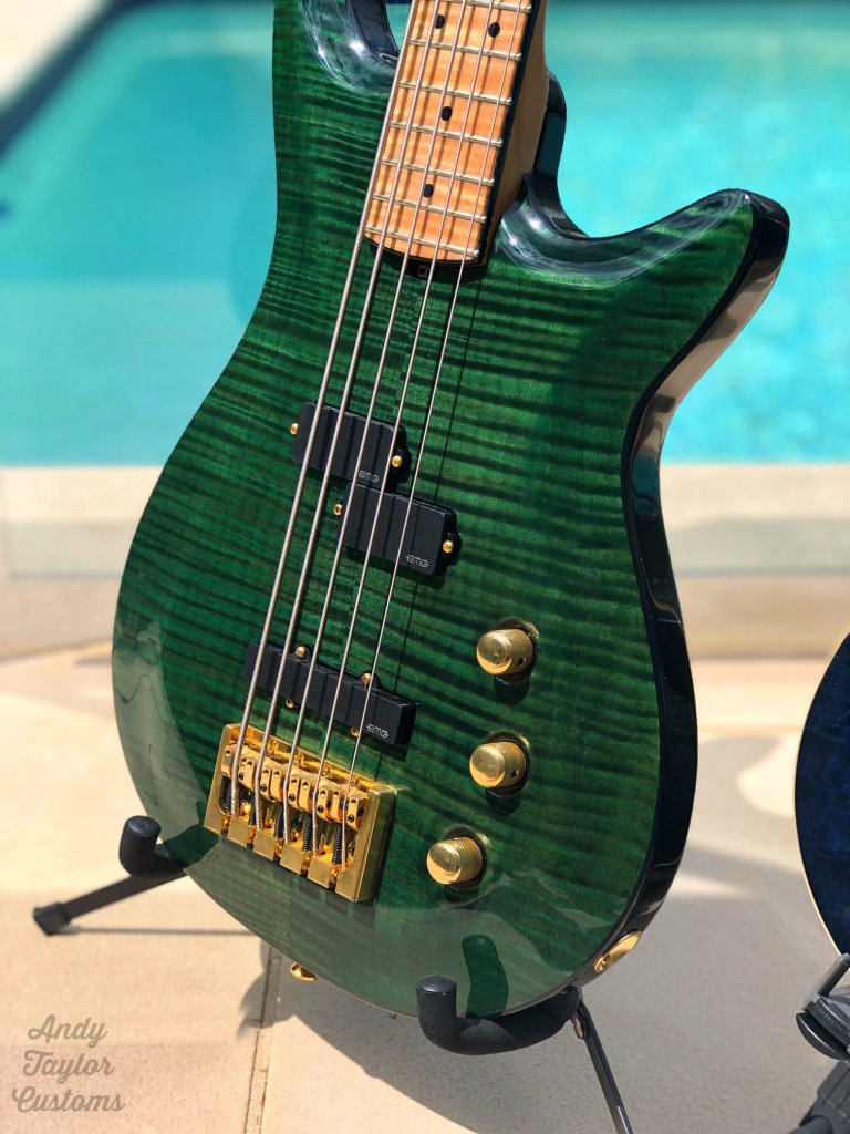 The 5-stringed bass beauty. A custom style bass with double cutaway, inspired by the Precision shape, but with a strong carve on the front. It’s certainly a crowd pleaser.