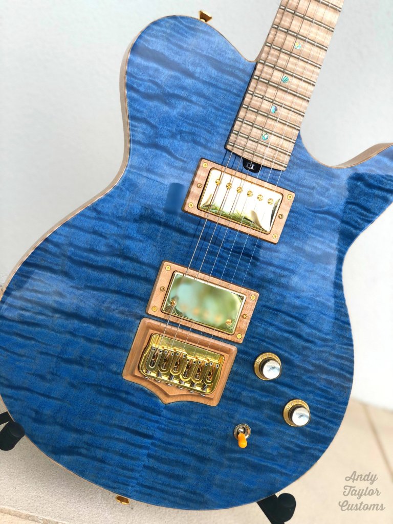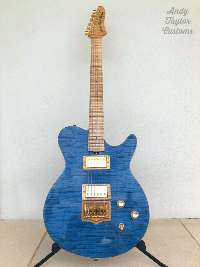The Ocean Blue is an ATC design melding the Les Paul & the Telecaster into a custom style. Nicknamed “Andycaster” by its current owner.
