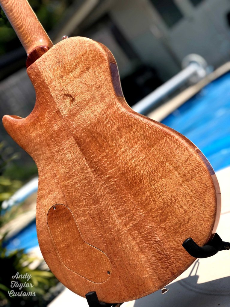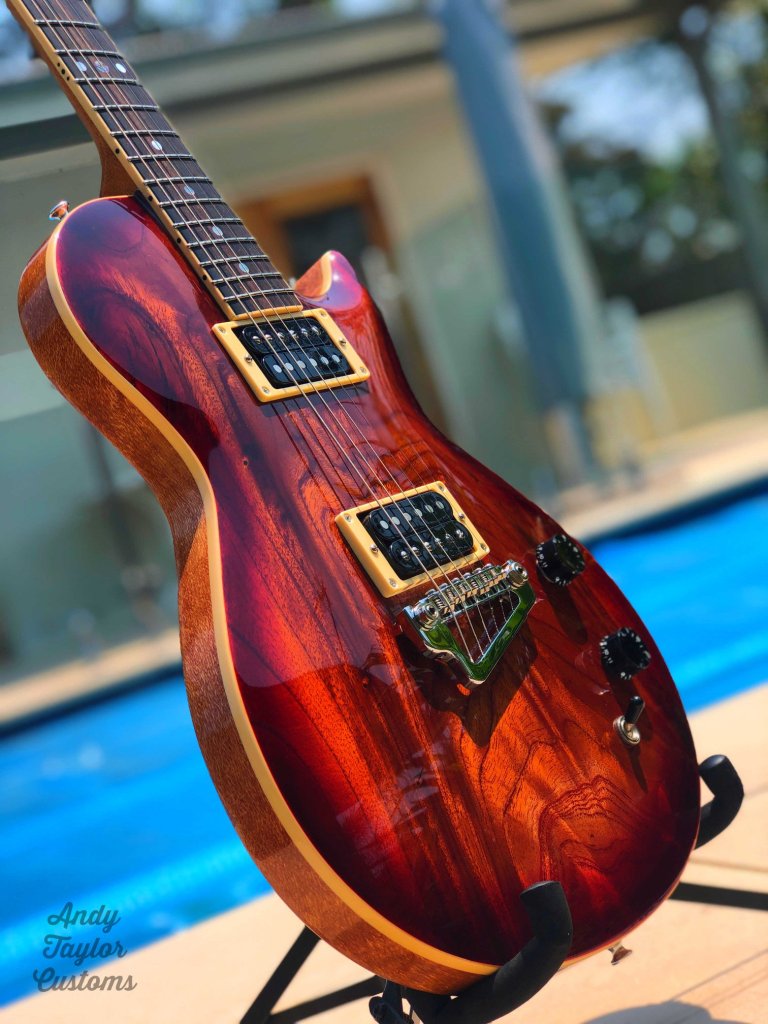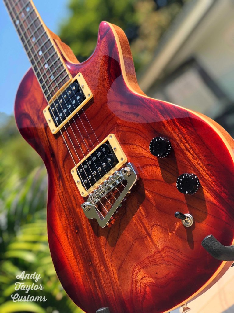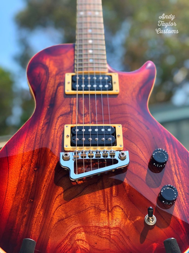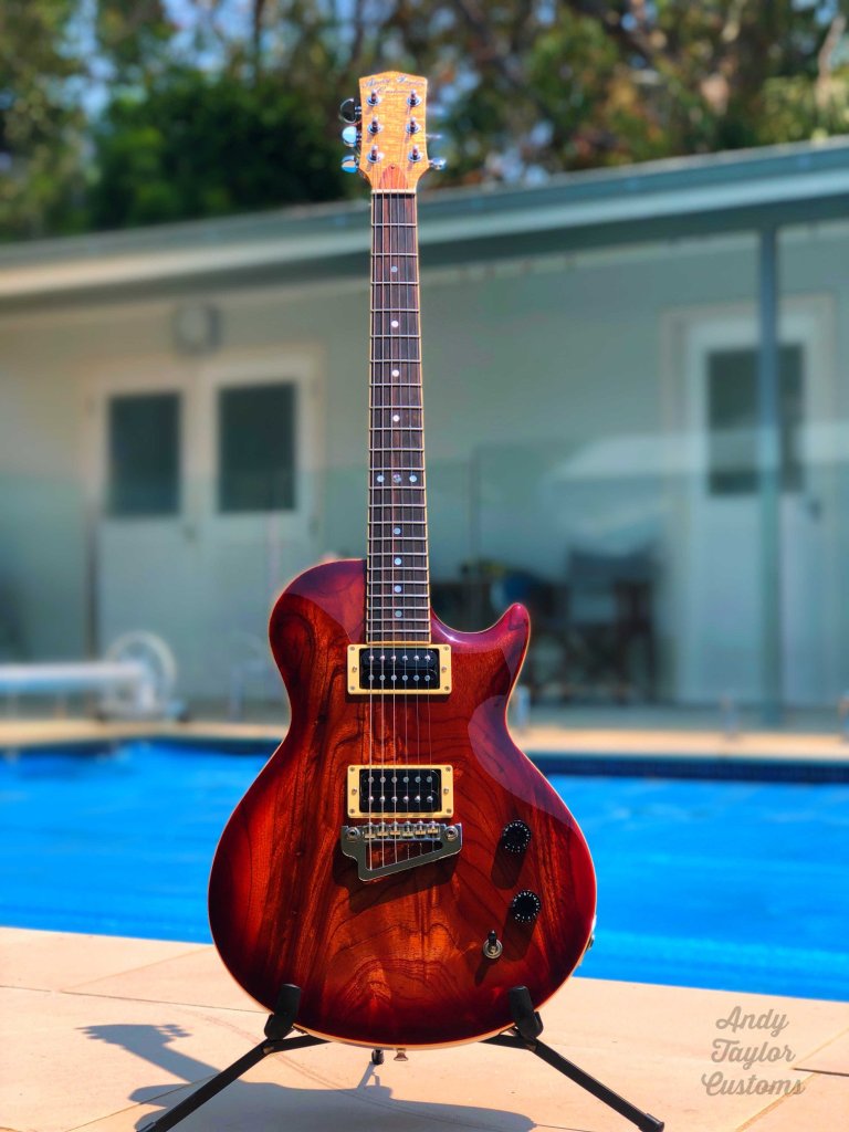 The Red Cedar is a Les Paul inspired guitar. Owner sourced timbers & hardware and then built under owner scrutiny. A very pleasing outcome and my first foray into Aussie grown timber.
